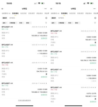 I always start with 0.5 $BTC positions. As the market knew, war escalated, causing market decline. My liquidation price was around $98,800. On June 22nd, with reports of potential US involvement, prices rapidly dropped. After weighing options, I chose to stop loss at $100,567.