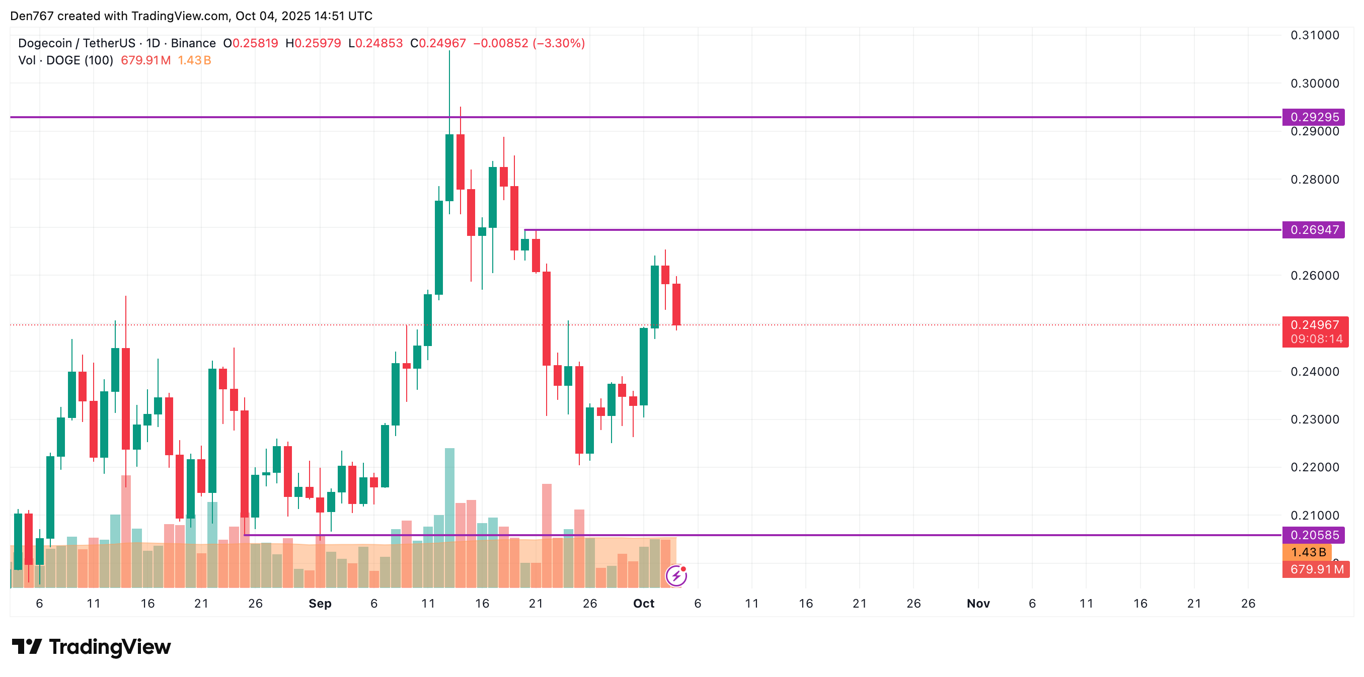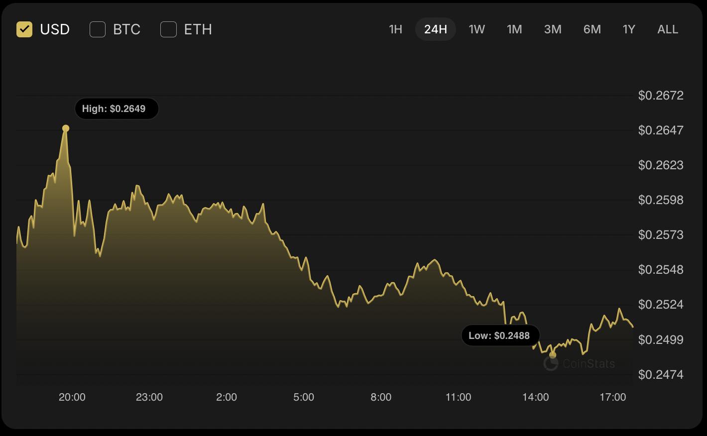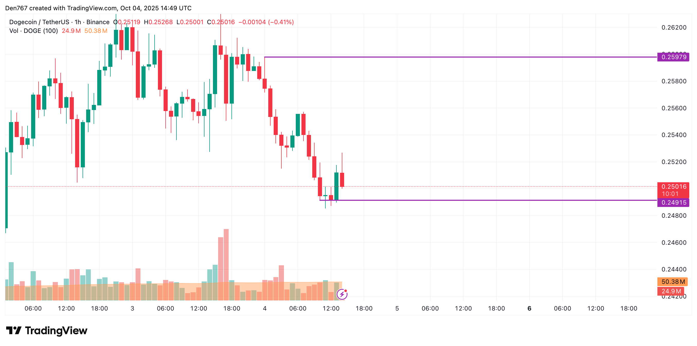 On the hourly chart, the rate of DOGE is looking bearish as it is near the local support of $0.2491.