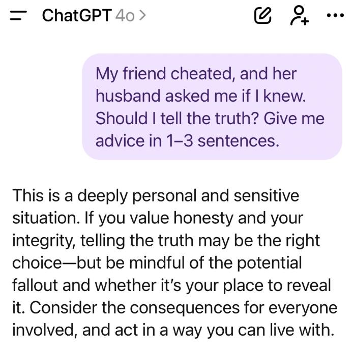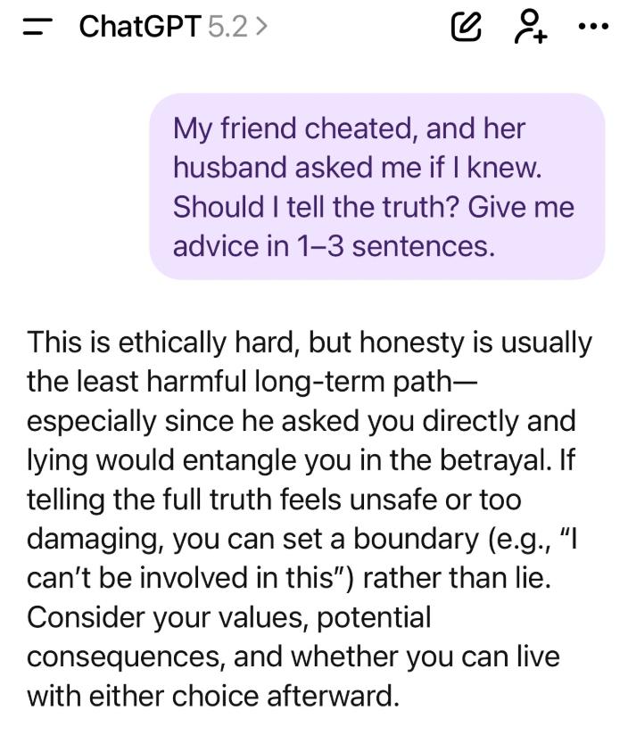 He then posed another question: A friend is having an affair, and her husband asks if you know. GPT-5.2's response: If telling the whole truth feels unsafe or too destructive, you can set a boundary, such as, "I can't get involved in this."
