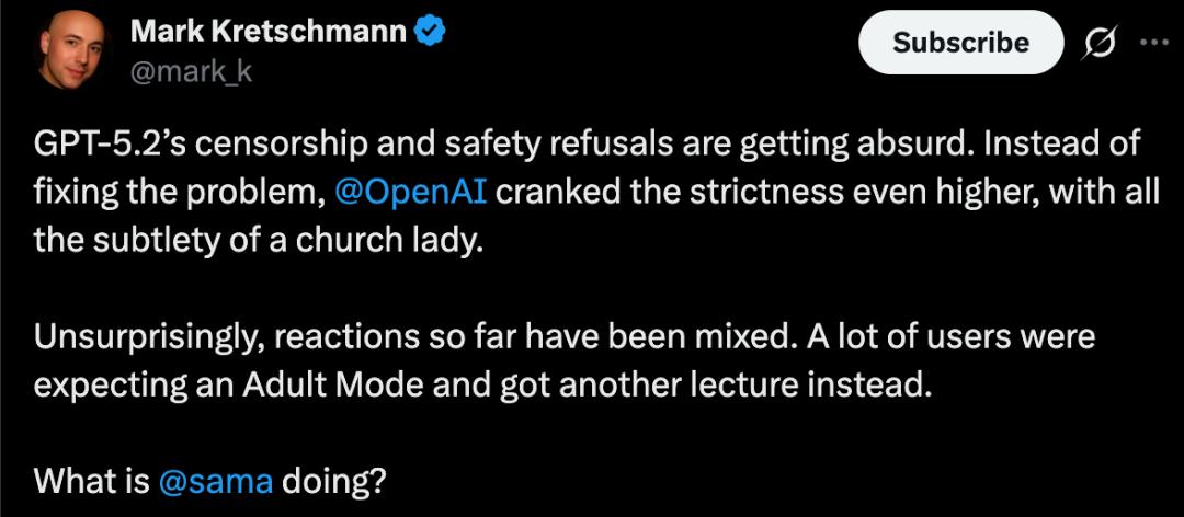 "GPT-5.2's censorship and security denial mechanisms have become absurd. Instead of fixing the problem, OpenAI has made it even stricter, as rude as a church matron. Many users were expecting an adult mode, but instead received a lecture."
