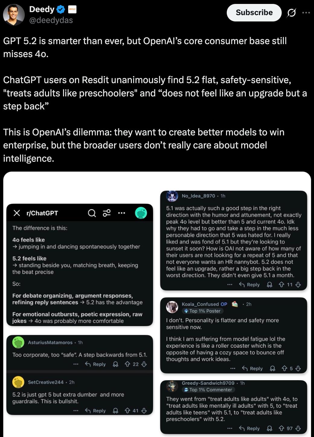Menlo Ventures partner @deedydas posted that GPT 5.2 is smarter than ever before, but OpenAI’s core consumer base still misses the 4O.