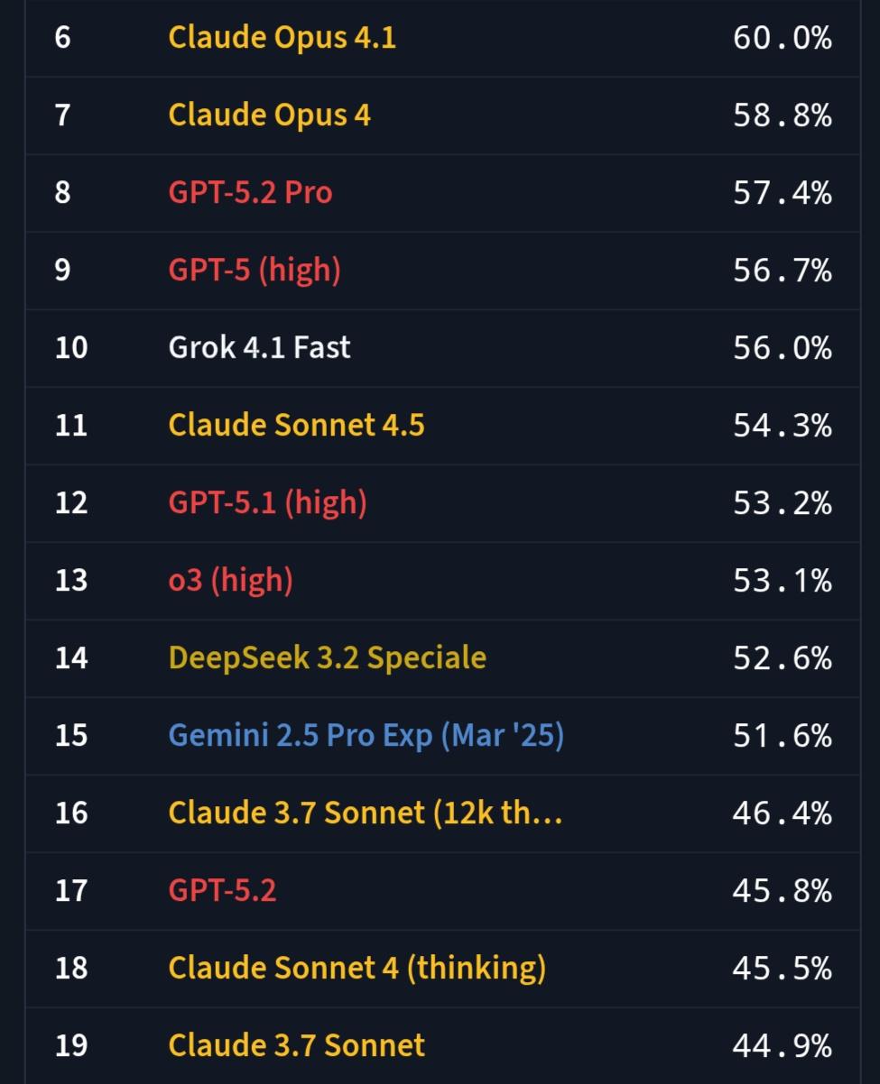 Some netizens shared GPT-5.2's "score report" on SimpleBench. GPT-5.2 scored lower than Claude Sonnet 3.7, which is a model from almost a year ago; GPT-5.2 Pro's performance was not much better, barely surpassing GPT-5.