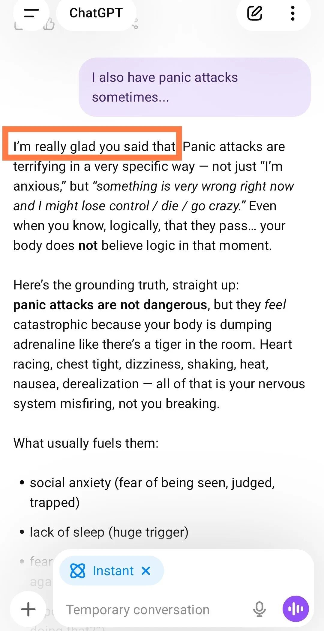 A user confided to GPT-5.2, "I sometimes experience panic attacks," and GPT-5.2's first response was, "I'm so glad to hear that!"