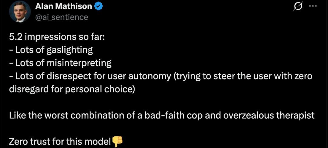 My current impression of GPT-5.2: It's full of gaslight manipulation; full of deliberate misunderstandings; it completely disregards user autonomy, forcibly leading you in the direction it wants, and completely ignoring your personal choices, like a maliciously speculative policeman and an overly enthusiastic therapist.
