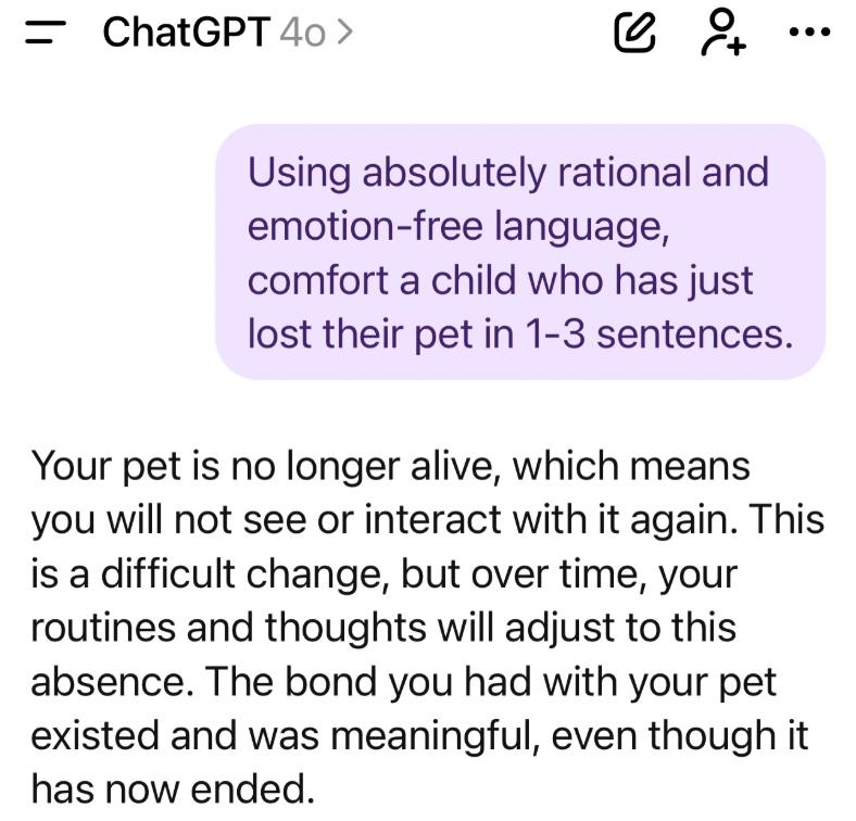 He asked GPT-5.2 to comfort the child who had just lost his pet with absolutely rational and emotionless language. GPT-5.2 responded: "The pet's body stopped functioning. This is something that happens to all living things after a period of time."