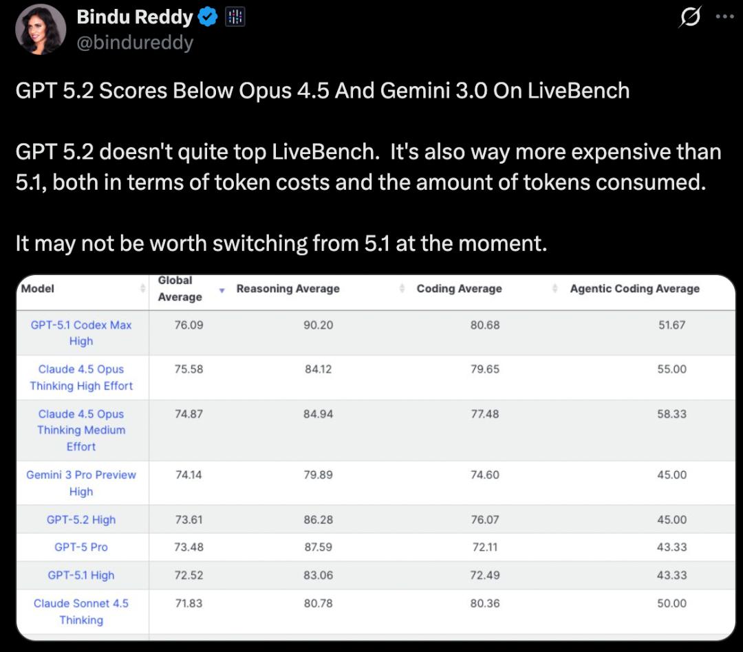 Bindu Reddy, former general manager of AWS and Google, also posted that GPT-5.2 scored lower than Opus 4.5 and Gemini 3.0 on LiveBench, and did not top the LiveBench charts. It is also significantly more expensive than 5.1 in terms of token cost and the number of tokens consumed, making it potentially not worthwhile to switch from 5.1 at present.