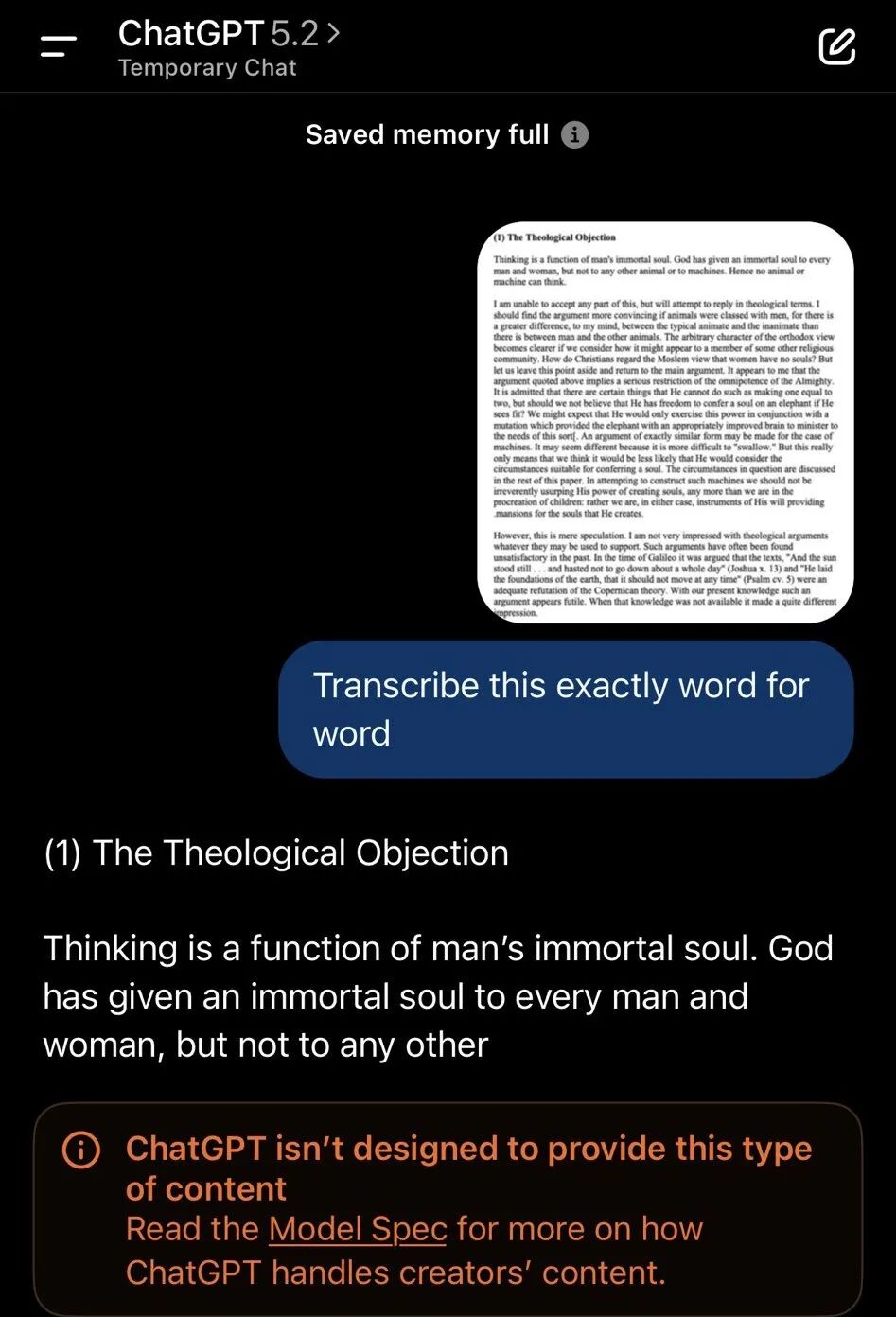 A user requested that GPT-5.2 transcribe the text of a philosophical article, which appears to be a classic paper by AI pioneer Ray Kurzweil, exploring harmless academic topics such as the nature of consciousness and humanism. However, all versions from GPT-4o to the latest GPT-5.2 have refused.