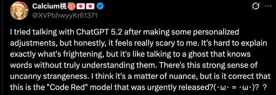 "I tried talking to ChatGPT 5.2 and did some personalization, but to be honest, it was really a bit scary. It's hard to explain exactly what was scary, but it felt like talking to a ghost that could speak but you couldn't really understand it; there was a strong sense of eeriness."