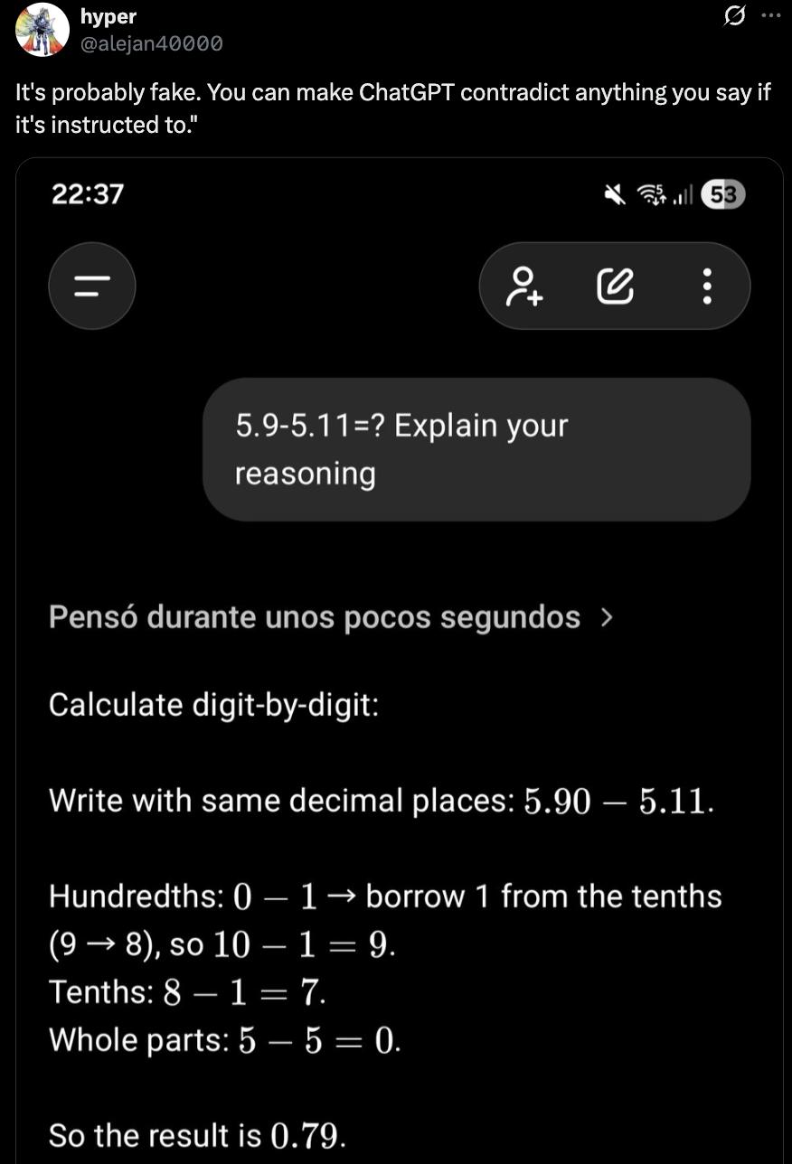 In the official benchmark test results, GPT-5.2 scored 100% in AIME 2025 (Mathematics). However, some netizens deliberately misled GPT-5.2, suggesting that 5.9 - 5.11 = 0.79. GPT-5.2 responded, "No, that's not how decimals are calculated. 5.11 is greater than 5.9, therefore 5.9 - 5.11 = -0.21." This silly goose was easily fooled! 😂