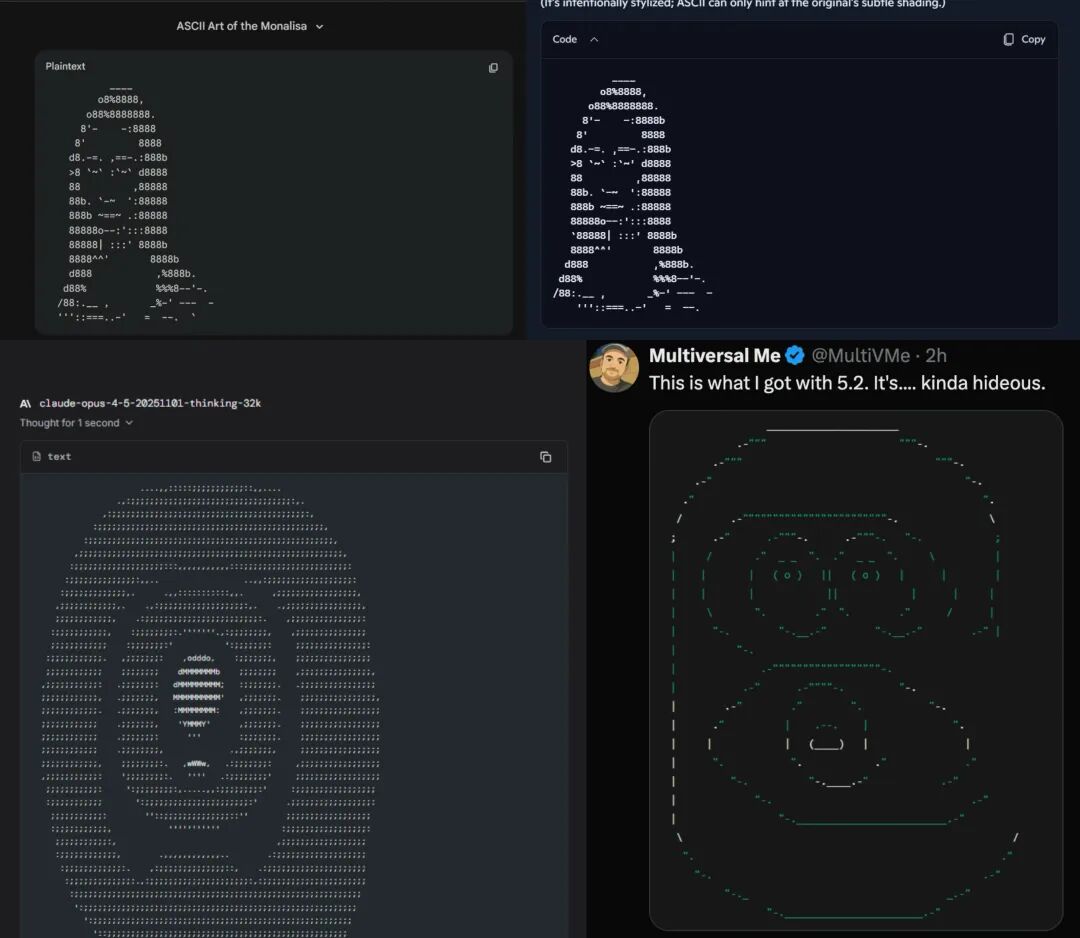 The netizen also asked GPT-5.2 and GPT-4o to create ASCII art of the Mona Lisa. GPT-5.2's work was incredibly abstract, while GPT-4o actually captured some of the Mona Lisa's essence.