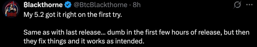 In short, the responses to GPT-5.2 are very inconsistent; some are correct, while others are nonsense. Some netizens speculate that, like the previous version… the first few hours after release were indeed terrible, but they will fix the issues afterward, and then it will work as expected.