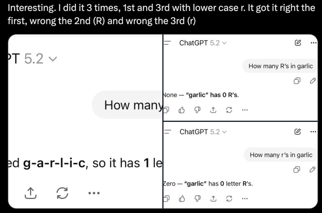 Previously, the question "How many 'r's does Strawberry have?" stumped many large models, but after iterations, these models can now generally answer correctly. This time, a netizen asked a different question: "How many 'r's does Garlic have?" GPT-5.2 answered immediately: 0. The netizen sarcastically remarked: "GPT-5.2 is AGI."