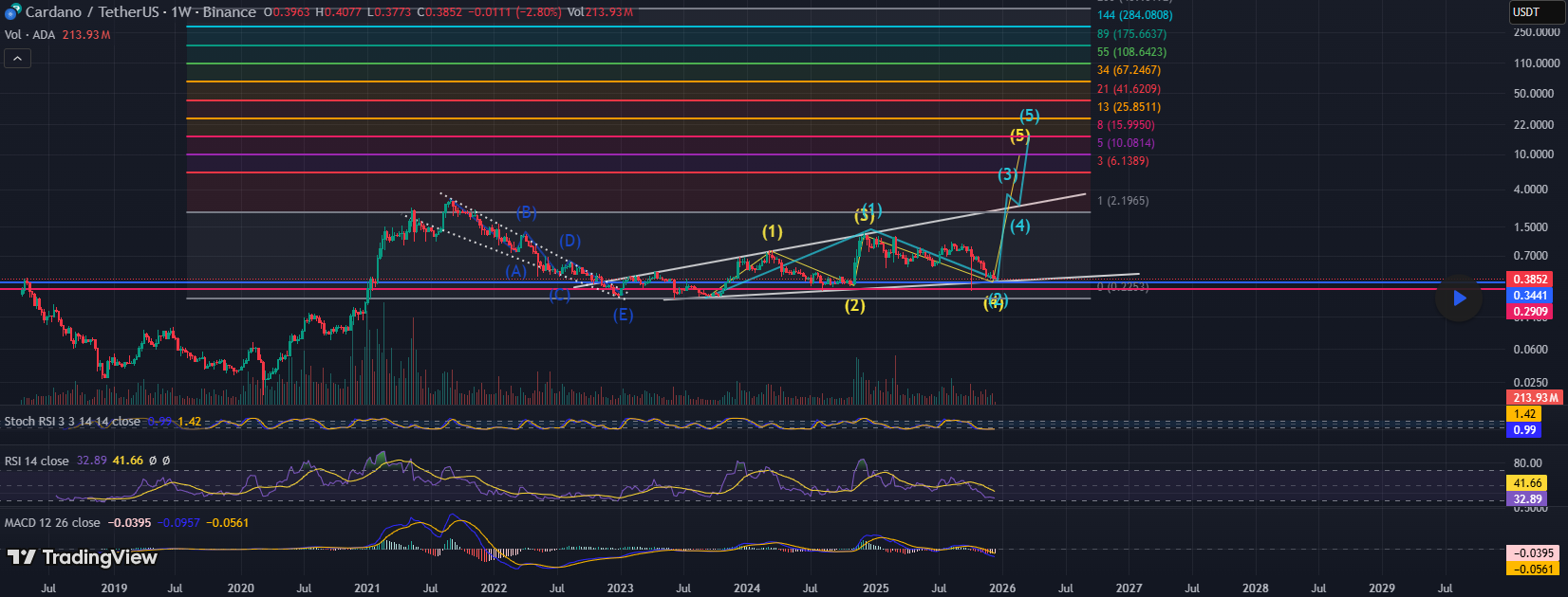 An extensive Elliott Wave structure began forming around the support area in September 2023, with the first progressive wave pushing ADA to a high of $1.32 in December 2024. From there, the second corrective wave began and has persisted to its current price lows of $0.37.