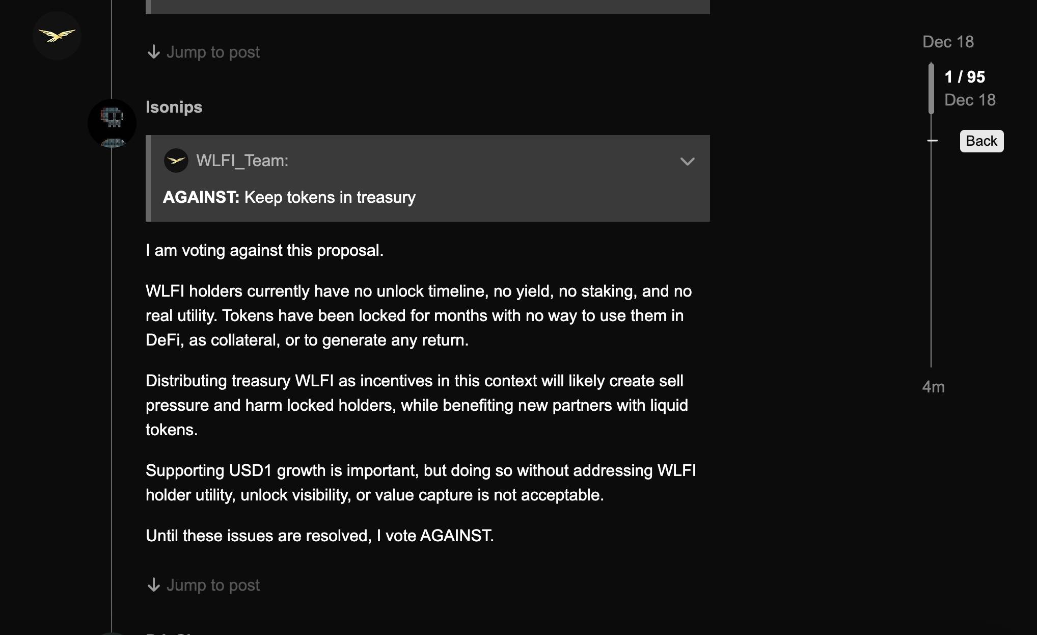 Many holder argue that WLFI currently offers no yield, no Staking, and is almost solely for governance purposes, while the Token remains locked for months. Therefore, bringing WLFI from the treasury to the market at this time could create selling pressure, causing long-term holders to suffer losses.