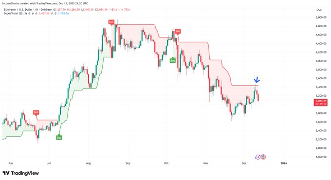 $ETH - Supertrend rejection. Will see if if it can consolidate and make another attempt or if that was the best rally it could put together for now. twitter.com/IncomeSharks/statu...
