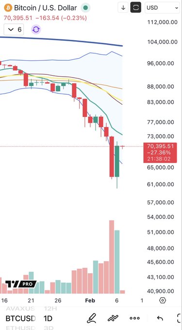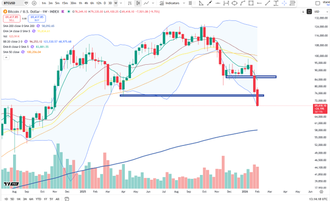 A weekly close above 73.7K-76.5K support area with a long lower wick will be very informative. $BTCUSD Let's see what the weekend brings. twitter.com/TechCharts/status/...