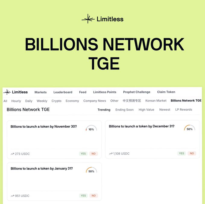 “Wen tge?” “Wen tge?” “Wen tge?” if you are familiar with this term, bingo, it's the classic question echoing through every pre-launch crypto community. it’s the same story every time: endless noise, wild guesses, and pure speculation. but @trylimitless is flipping that chaos into structure with a new prediction market focused on the tge date of Billion. their Creator-Launched Markets take all that collective attention and turn it into something tradable, auditable, and actually meaningful. tbh, I love that, way smarter to channel the hype. next prediction suggestion: Theoriq, Warden, Cysic - “Wen tge?” twitter.com/0xAndrewMoh/status...