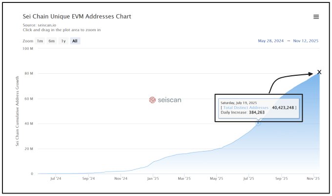 The total number of unique EVM addresses on @SeiNetwork has surpassed 80m since Sei launched their EVM back in July 2024. fyi: They only need under 4 months to double this stat. Remind me when it crosses 100m. twitter.com/0xAndrewMoh/status...
